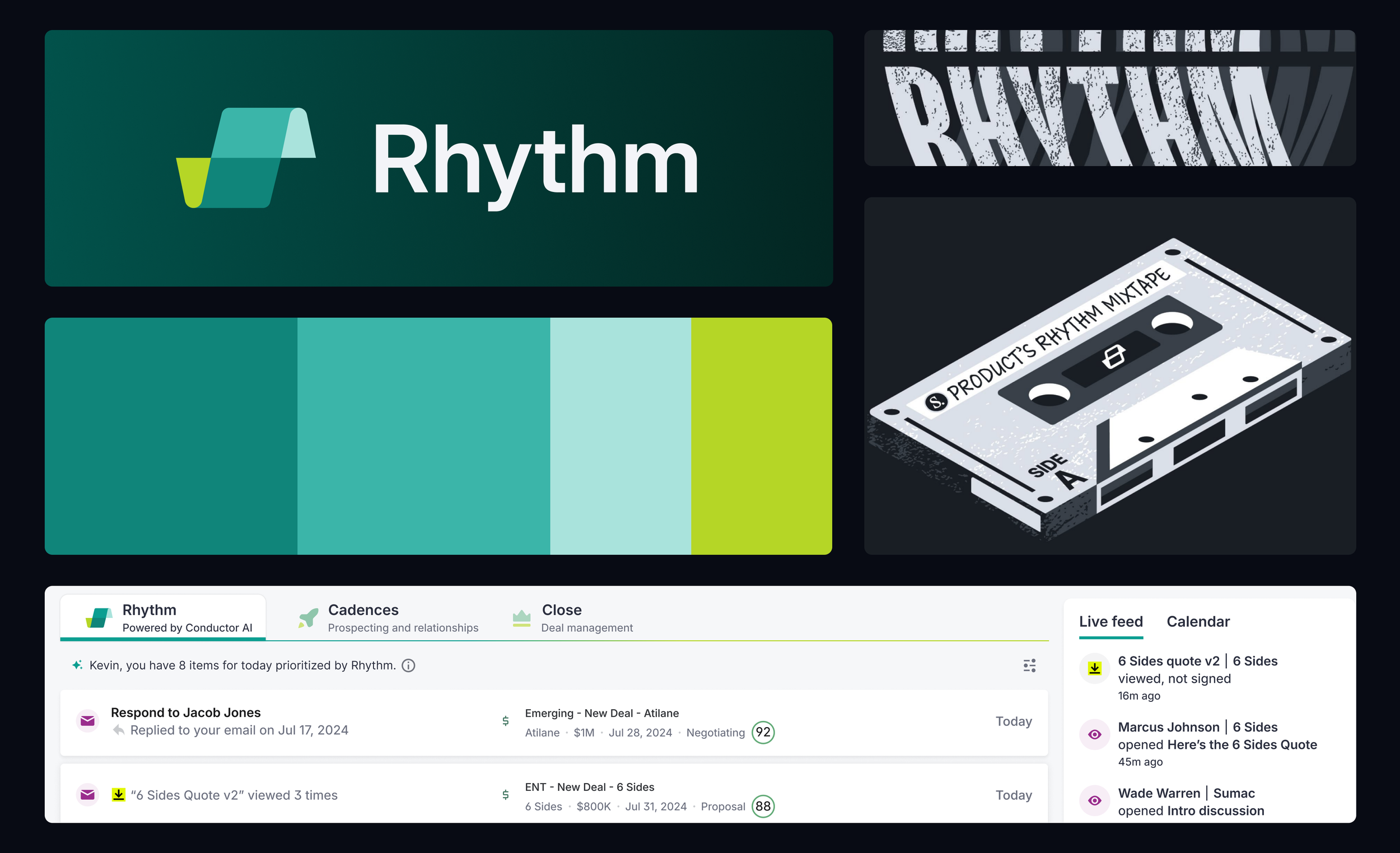 A collection of Rhythm assets, that span marketing materials, internal t-shirt concepts, and in-app icon placement
