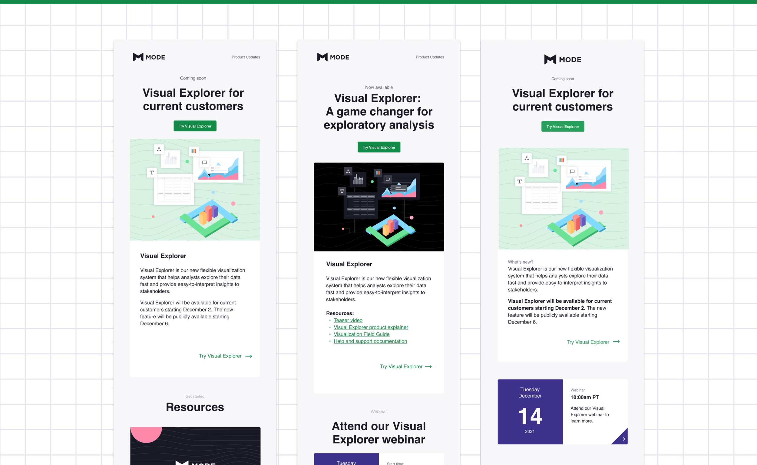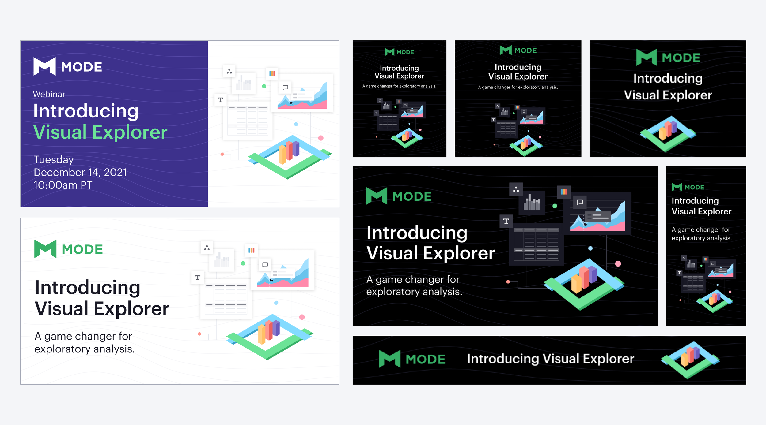 The primary objective was to launch Mode’s new Visual Explorer platform in a way that would generate excitement, build customer loyalty, and increase brand awareness. Mode needed a visual identity that not only captured the brand’s personality but also introduced a distinct, memorable look that would resonate with both existing customers and the broader data science community. This visual identity had to balance innovation and familiarity, ensuring it felt fresh and engaging while staying true to Mode's core values and appeal.