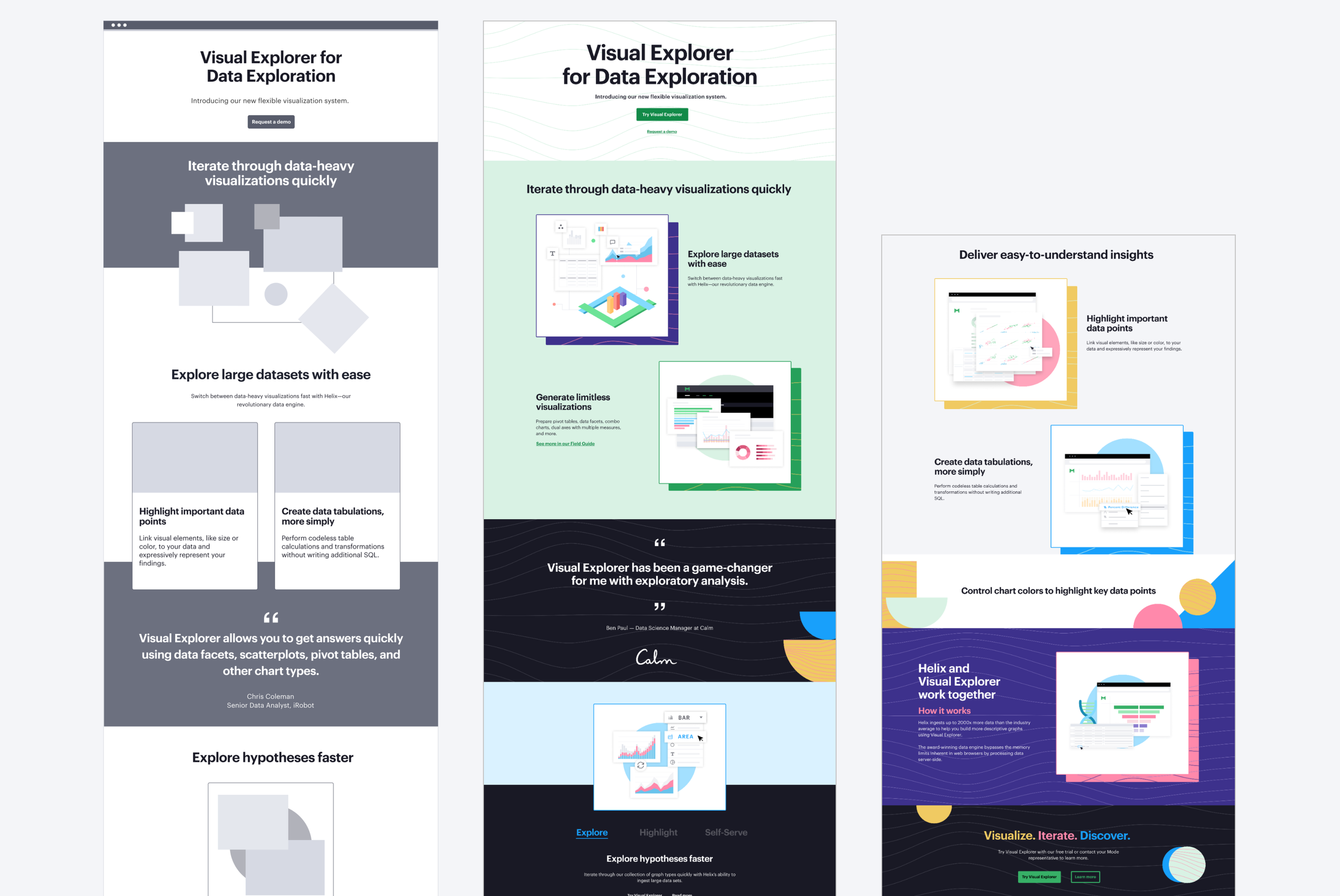 I developed a cohesive visual experience for Visual Explorer by creating a new product page, designing and coding email campaigns, marketing ads, and white papers. Ensuring consistency across all internal and external communication channels was crucial.