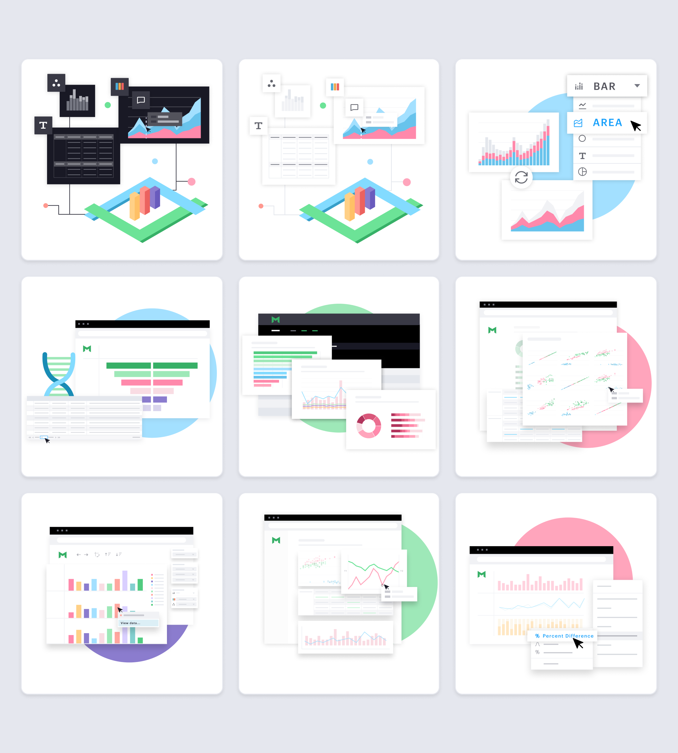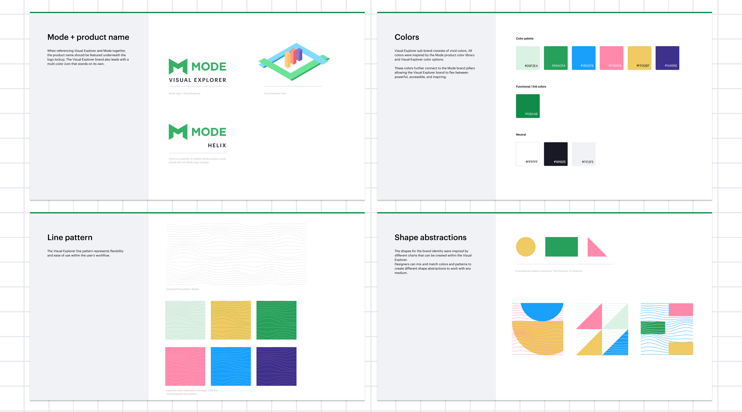 The visual design of Visual Explorer drew inspiration from the 'Grammar of Graphics,' incorporating foundational shapes and introducing fresh, vibrant colors, while staying true to the Mode product's aesthetic. It was essential that the visuals maintained consistency with the Mode brand but also felt new, colorful, and engaging.